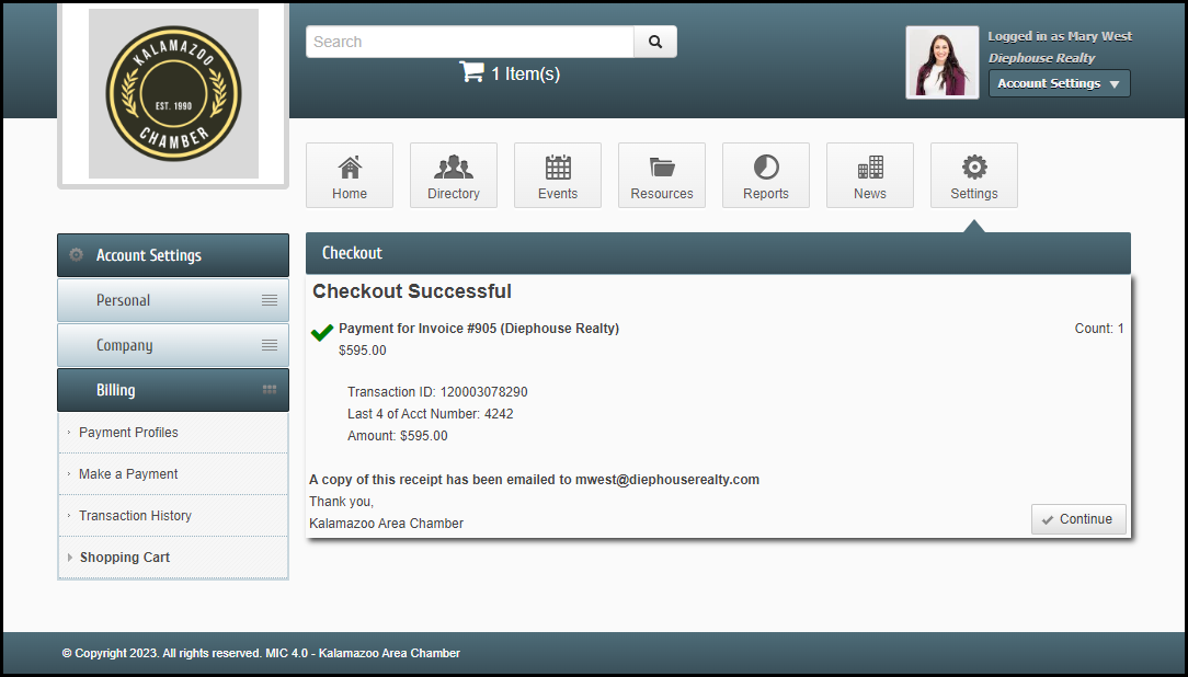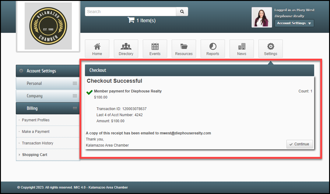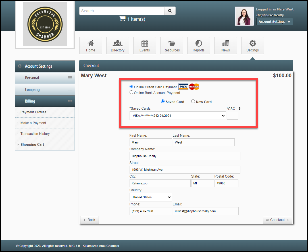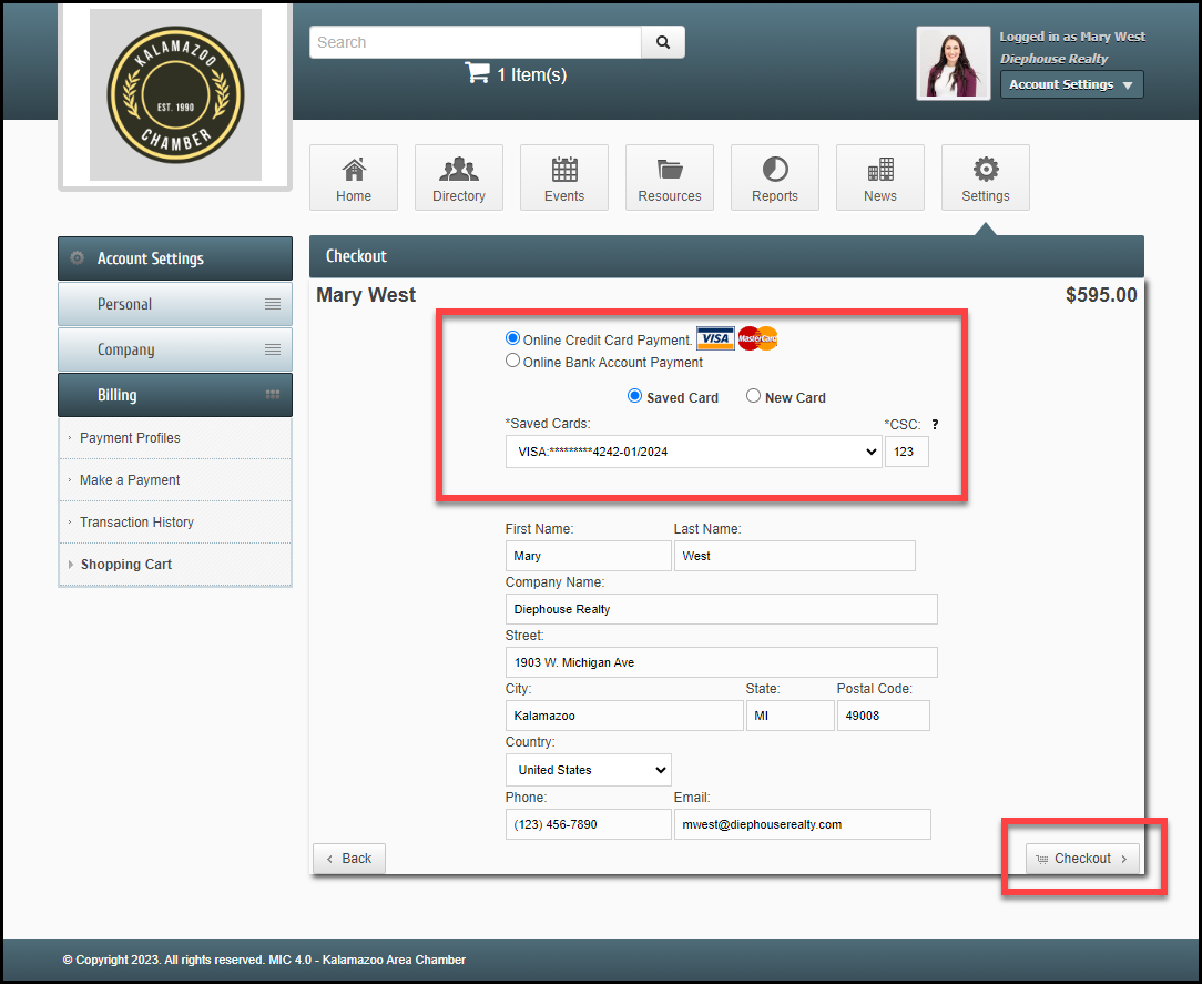 - In the Shopping Cart section, enter your payment information or select a previously saved Payment Profile. Select Checkout.