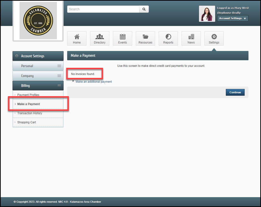 - In the Make a Payment section, No Invoices found will be displayed, indicating you do not have an open invoice.