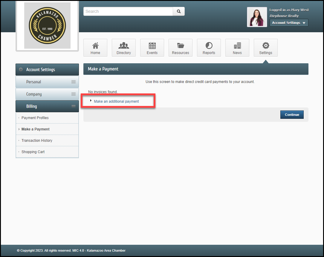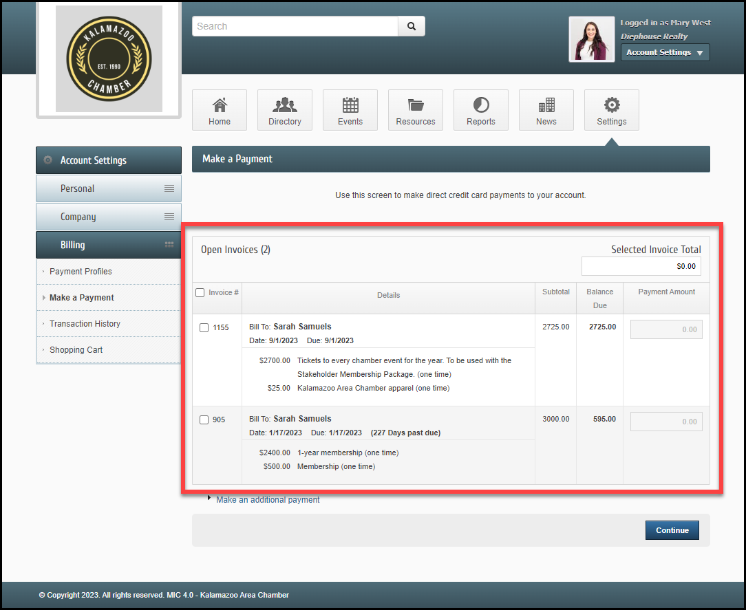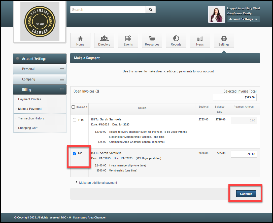 - Select the checkbox next to the invoice you would like to pay and select Continue to proceed with payment.