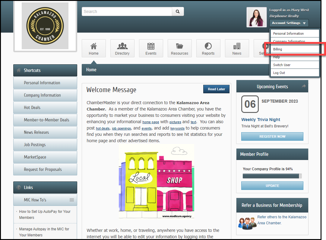 - After logging in to the MIC, click the Account Settings menu to navigate to the Billing area.