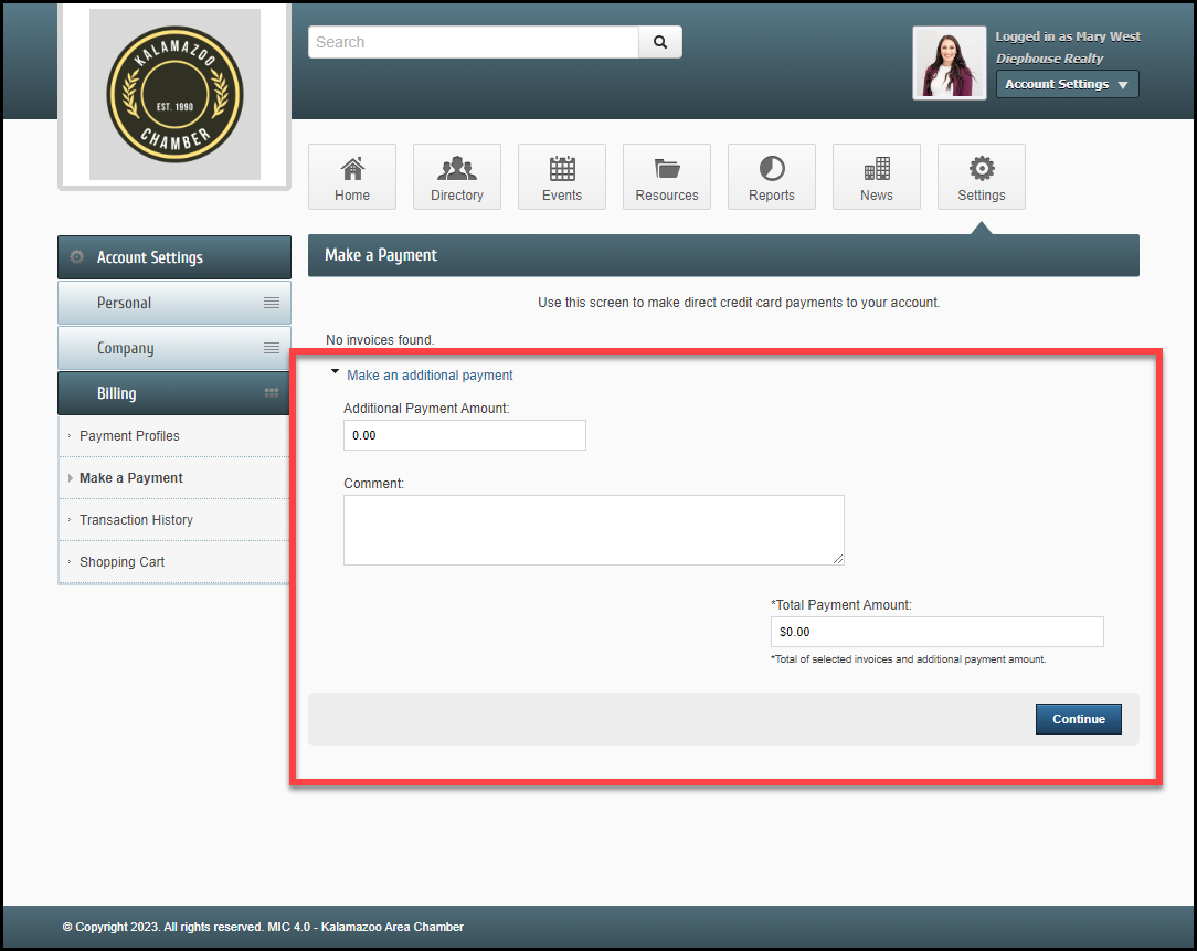 - Enter the amount of the additional payment. Include a comment so when your organization is notified of your payment, it can be applied according to your comment/request. Select Continue.