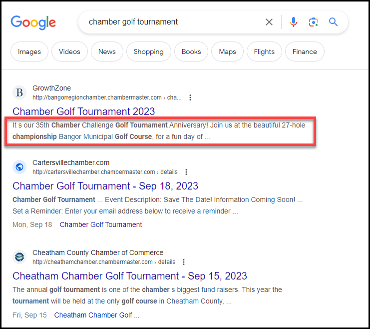 The Meta Description should be a 1-2 sentence summary of the event, and is often visible in search engine results, social media posts, and shares. Customizing the Meta Description allows you to better target your message and hopefully improve your click-through rate. If the Meta Description field is left blank, it will automatically populate with the Event Search Description (if available) and then fall back to the first 160 characters of the Event Description. The same text can be used for Search Description (if available) as what is used in the Meta Description field if you'd like. You can put more text into the Search Description field because it currently allows unlimited characters whereas the Meta Description is limited to 320 characters. But be careful not to get too wordy!