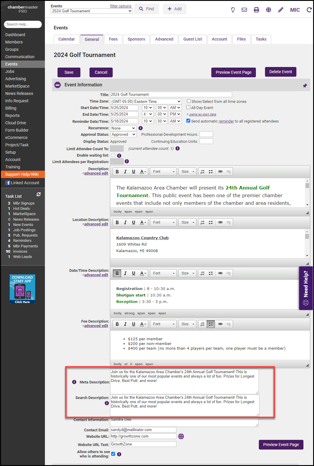 The Search Description text will display as "teaser text" in your website's event search results. Click here to view an example. The same text can be used for Search Description as what is used in the Meta Description field if you'd like. You can put more text into the Search Description field because it currently allows unlimited characters whereas the Meta Description is limited to 160 characters. But be careful not to get too wordy!