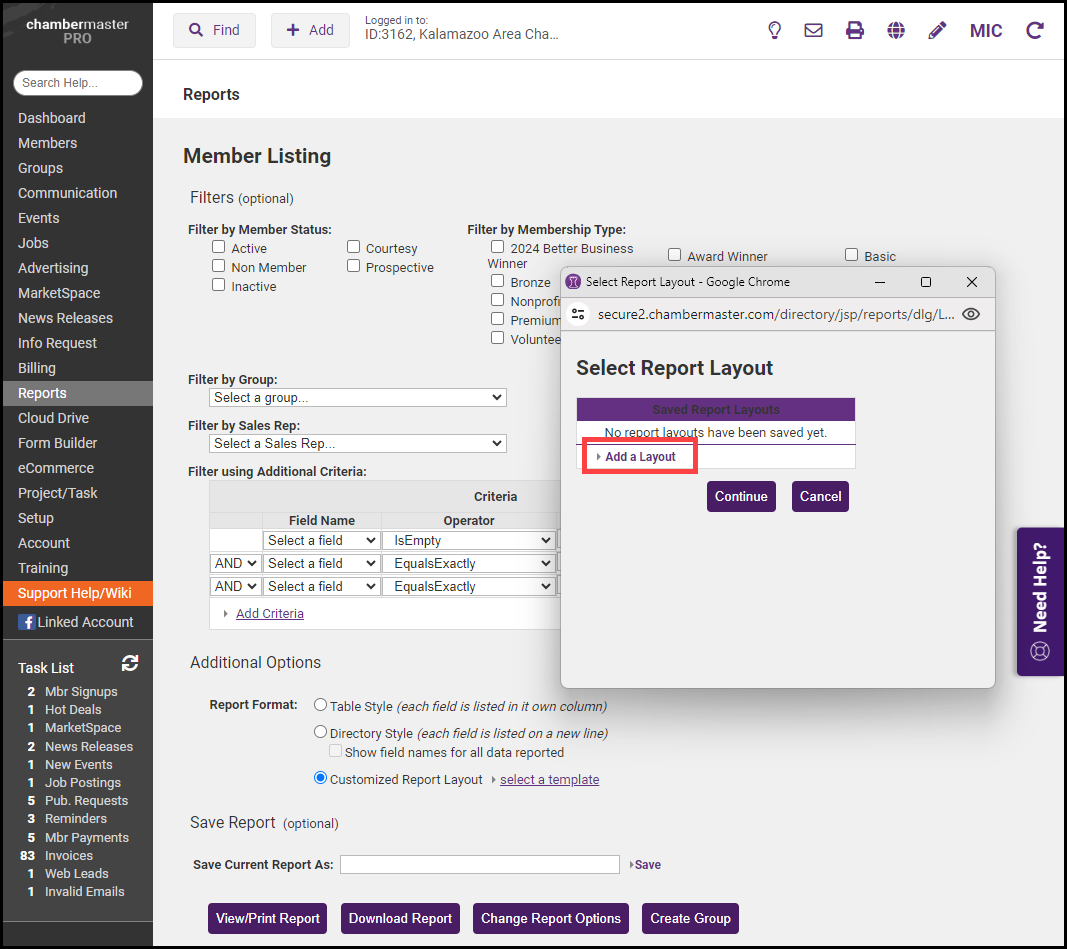 NOTE: If fields are included in the custom report layout, they must also be selected on the first custom report screen. See Custom Member Report or Custom Representative Report. |