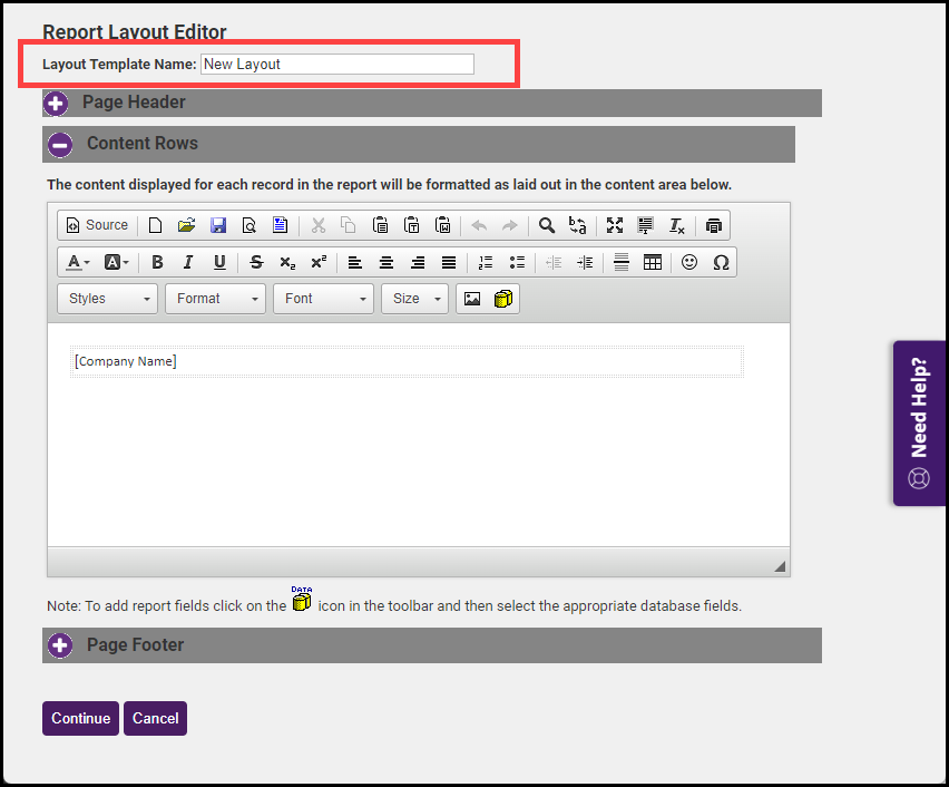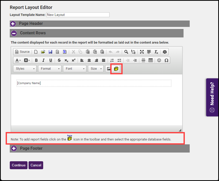 Complete the Page Header and Page Footer areas to design the top and bottom of each report page. Complete the Content Rows area to design what one record should look like by selecting the Add Database Field icon.