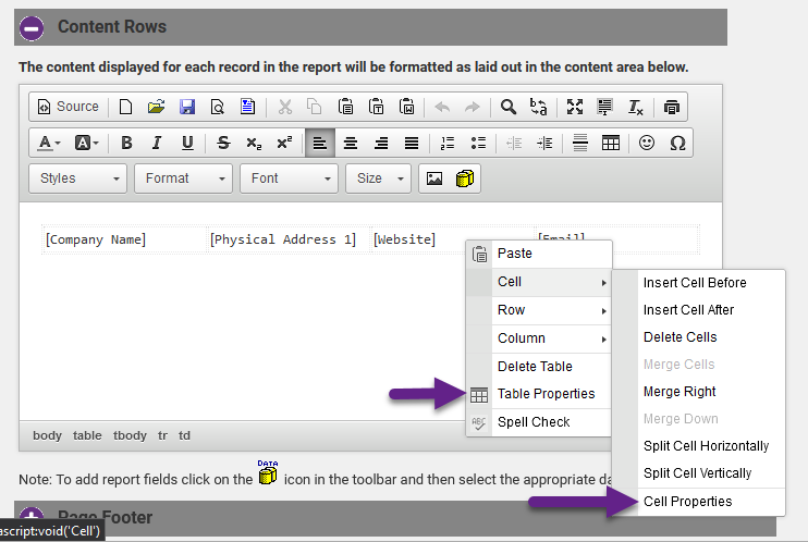 The editor window opens with selected fields placed inside a table. You may work within the table, or choose to recreate the placement of fields after deleting the table. Working within the table, however, easily allows fields to be aligned in columns. To modify the table, right-click anywhere within the table. Many placement and formatting choices are available by clicking Cell Properties in the Cell menu or by clicking Table Properties.