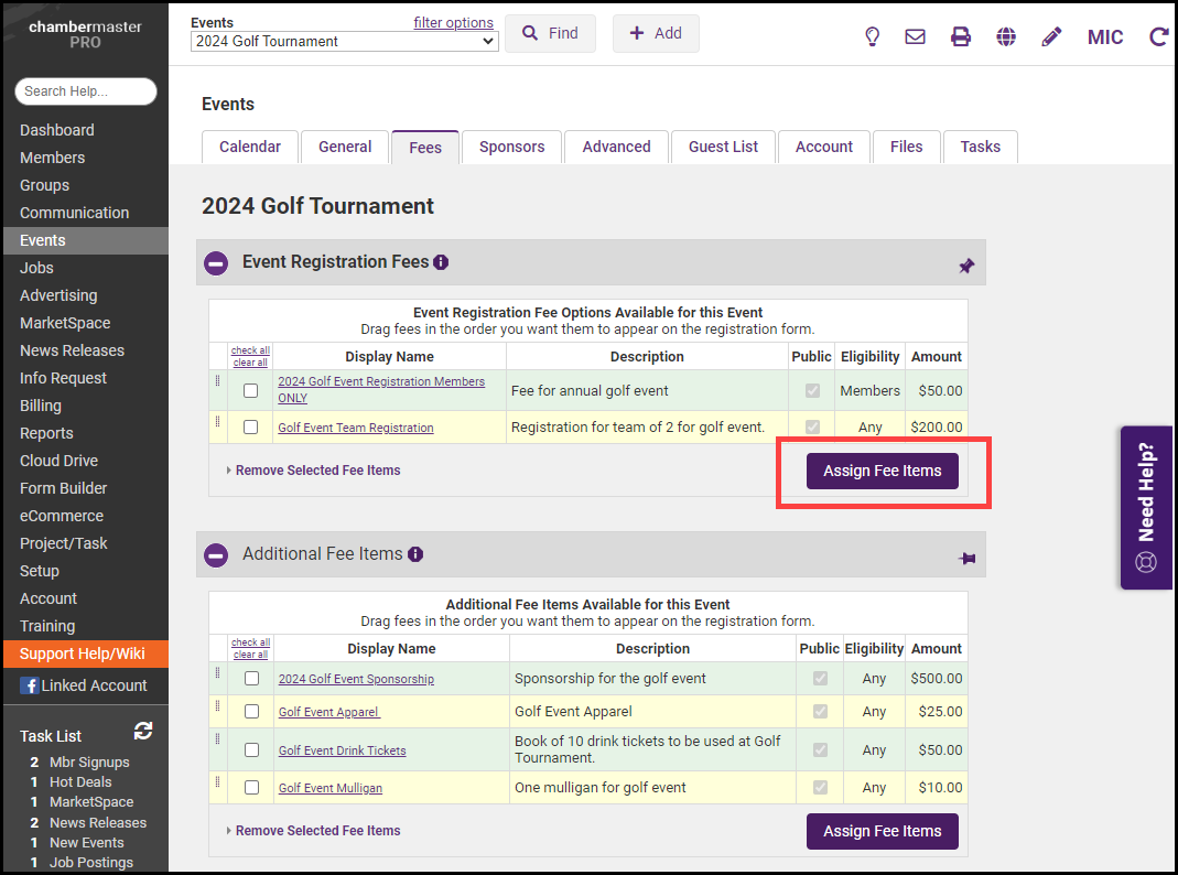 - Click the event's Fees tab.