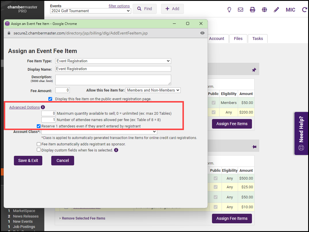 In the Assign an Event Fee Item window, select a fee item from the dropdown menu.