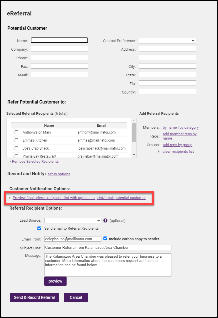 - To print the list for the potential customer, click Preview final referral recipients list with options to print/email potential customer.