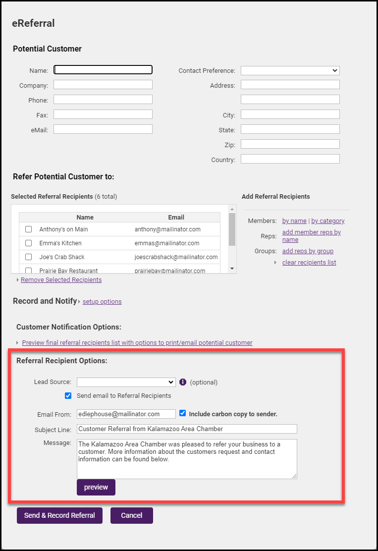 Send email to Referral Recipients: Selecting this box will send an email to those being referred and will record it in the member's Communication History. Deselecting this box will just record the eReferral in the member's Communication History and will not send an email to your members. Select Preview to view the information that will be sent to your members.