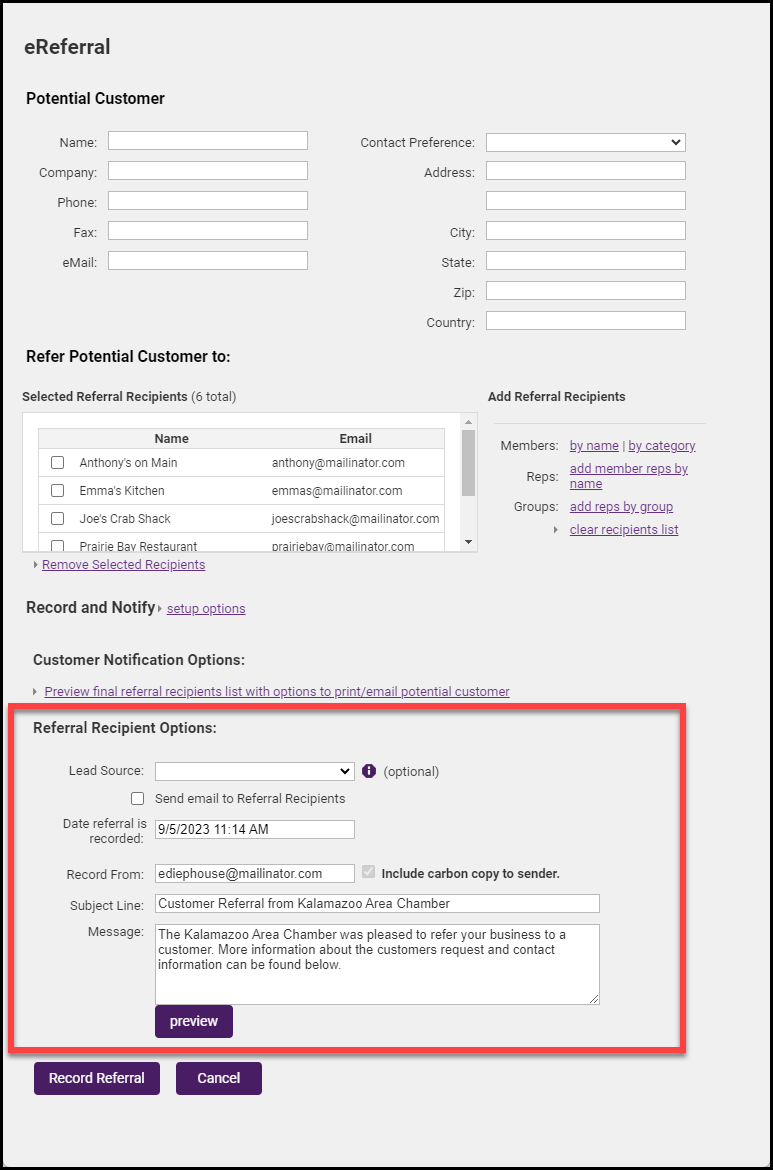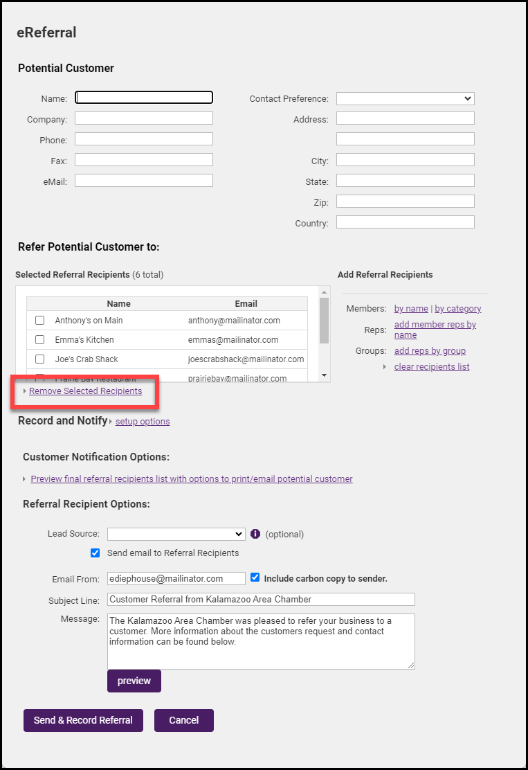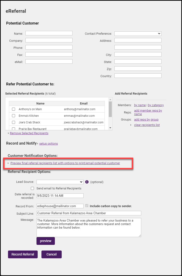 - To print or email the list of recommended businesses for the potential customer, click Preview final referral recipients list with options to print/email potential customer.