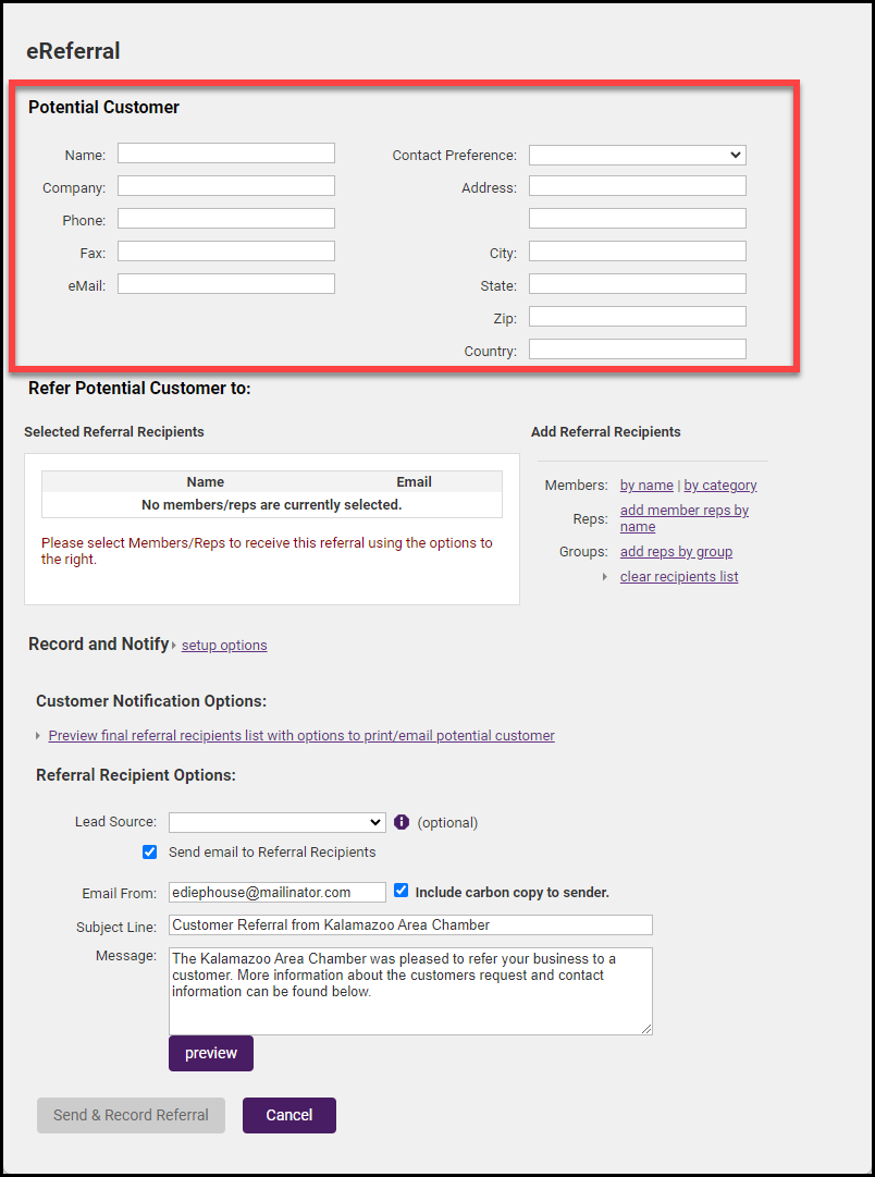 In the eReferral window, enter as much Potential Customer information as desired or is known.