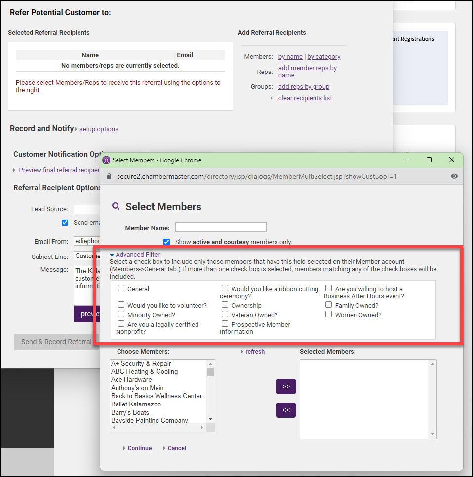 - When selecting members by name or category, you can expand the Advanced Filter section and filter by any member custom fields you have set up for your organization.