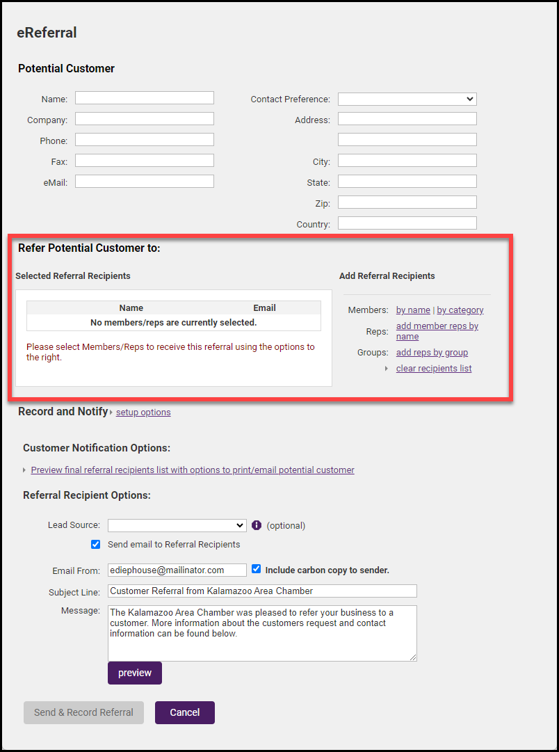 Select the members you wish to refer using the Add Referral Recipients area. You can select members by name or category. You can also choose specific representatives by name or by group.