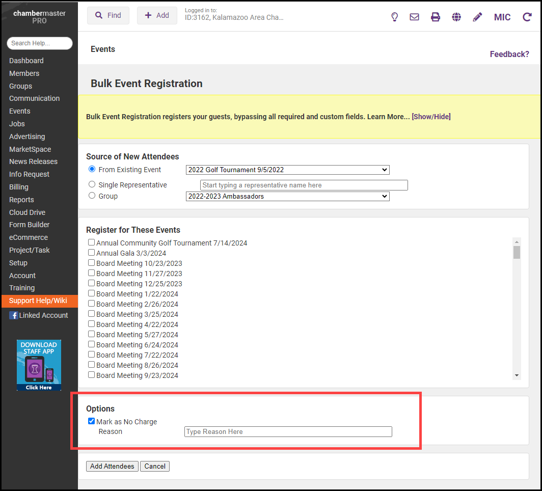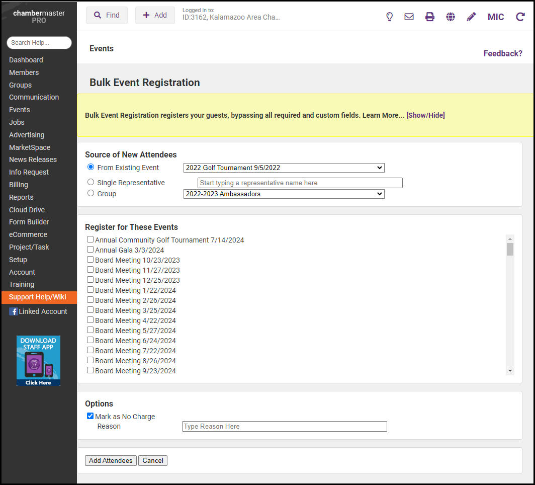 Do you need to register all the board members for all the Board Member Meeting events? Did the Gold membership type include automatic registration for Business After Hours? Do you have one rep who purchased the Monthly Luncheon package? You can easily add attendees to multiple events and display them as "Registered" on the Guest List. Bulk Event Registration registers your guests, bypassing all required fields, including custom fields. Look for these attendees on your Guest List with the comment Added by bulk registration.