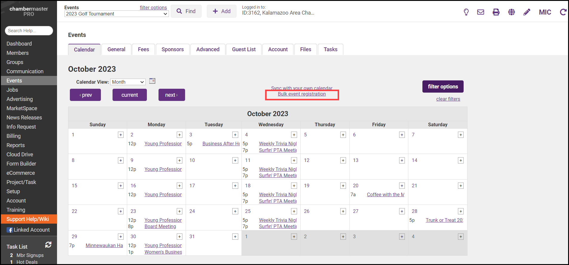 - Then click on the Bulk Event Registration.