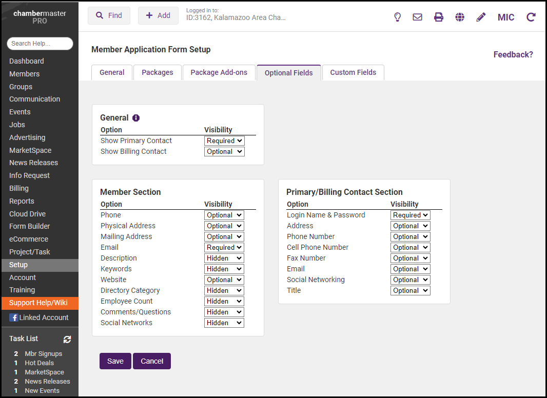 The Optional Fields available are those standard with the Membership Application. You can configure which ones you wish to display, display, require, or hide.