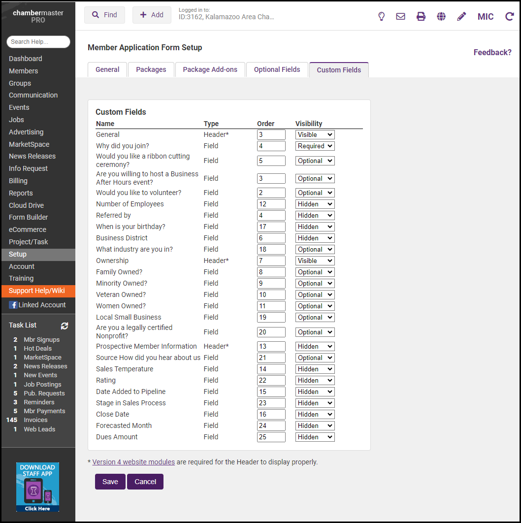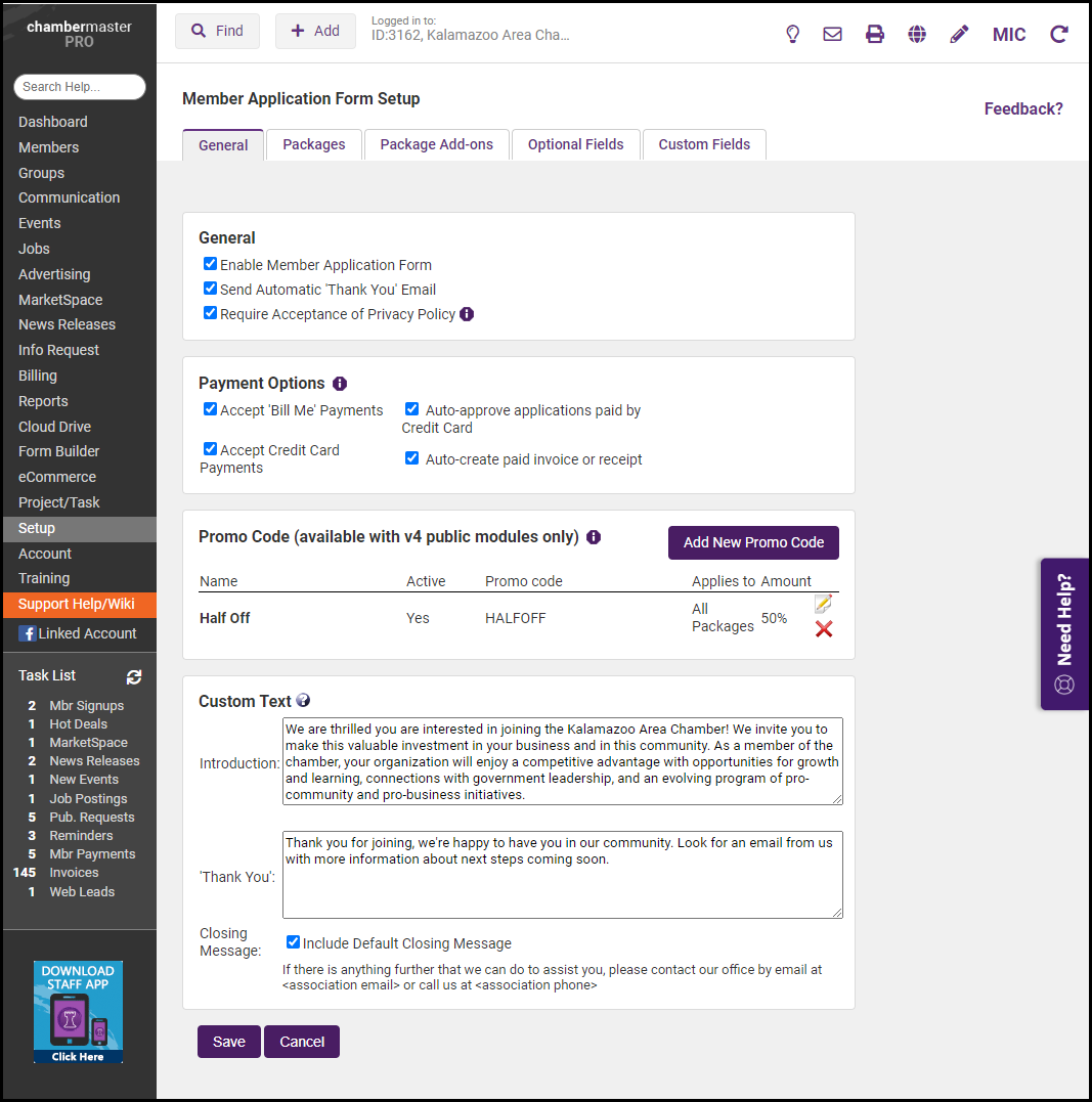 - Enable Member Application Form must be checked for the application to be available for integration to your website.