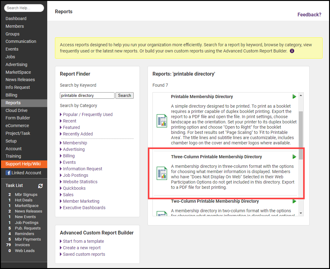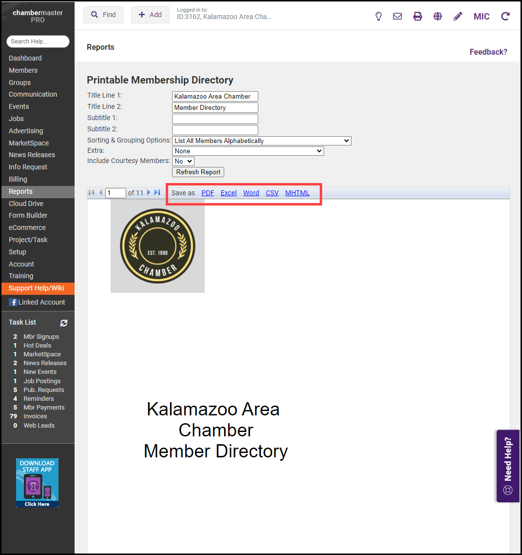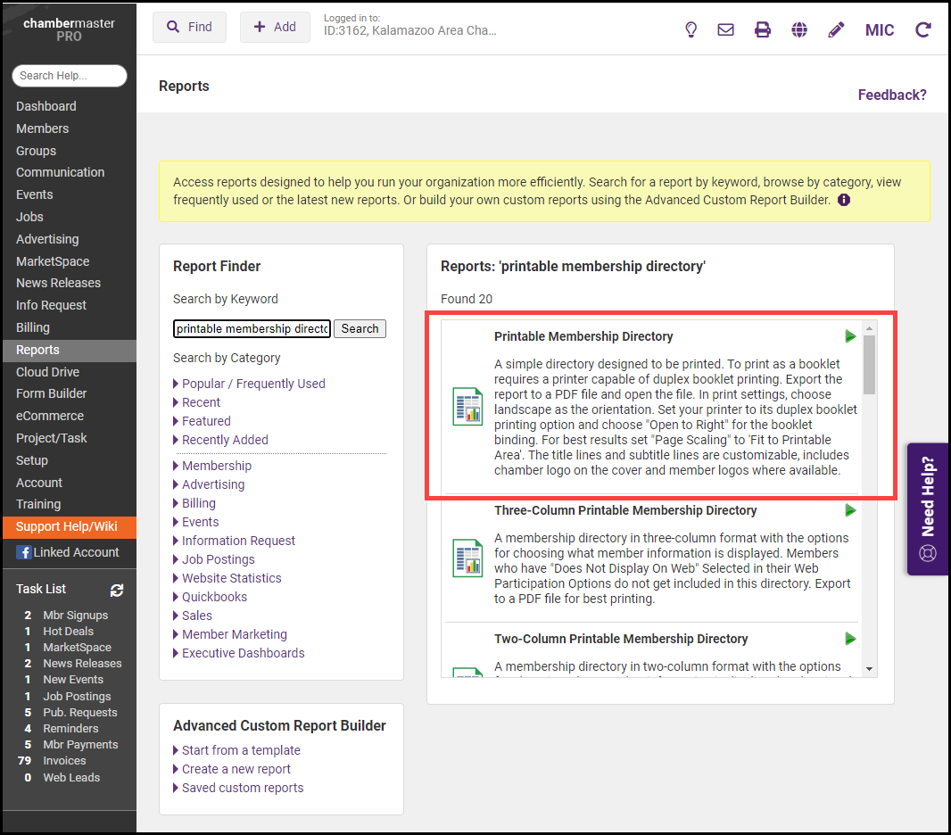 The Printable Membership Directory is a simple directory designed to be printed. To print as a booklet requires a printer capable of duplex booklet printing. Export the report to a PDF file and open the file. In print settings, choose landscape as the orientation. Set your printer to its duplex booklet printing option and choose "Open to Right" for the booklet binding. For best results set "Page Scaling" to 'Fit to Printable Area'. The title lines and subtitle lines are customizable, including the chamber logo on the cover and member logos where available.