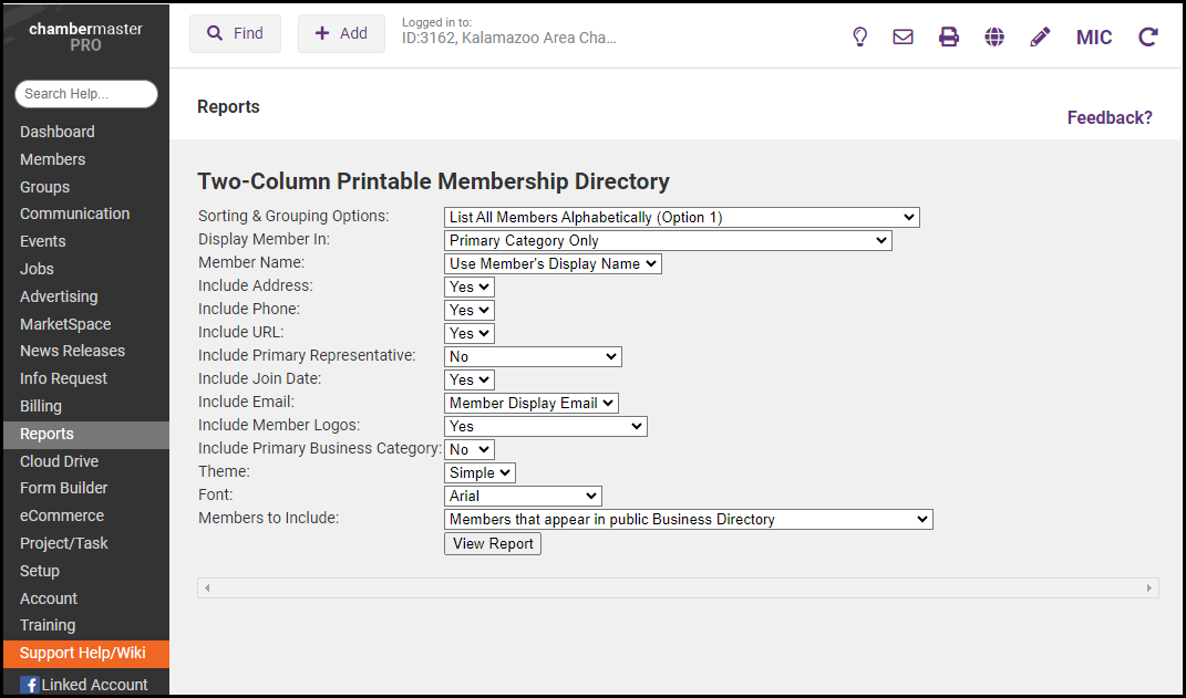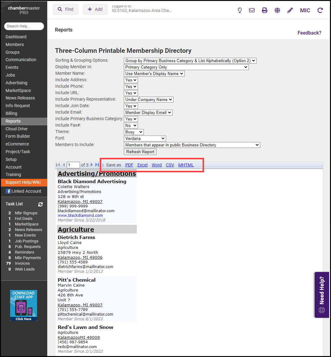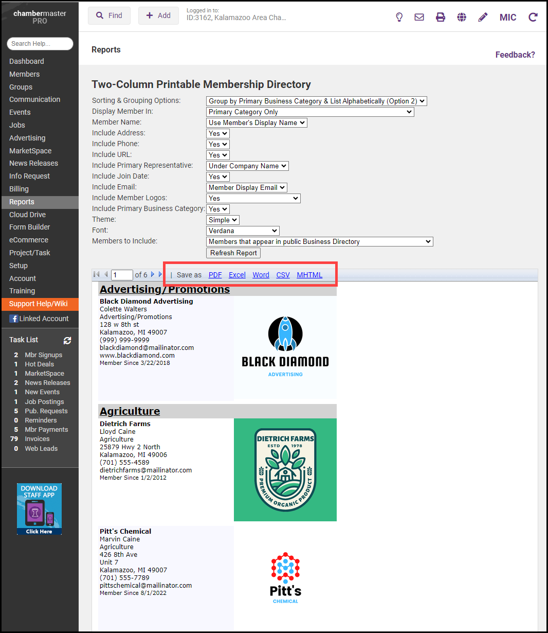 The Two-Column Printable Membership Directory is a membership directory in two-column format with the options for choosing what member information is displayed and optional member logos. Export to a PDF file for best printing.