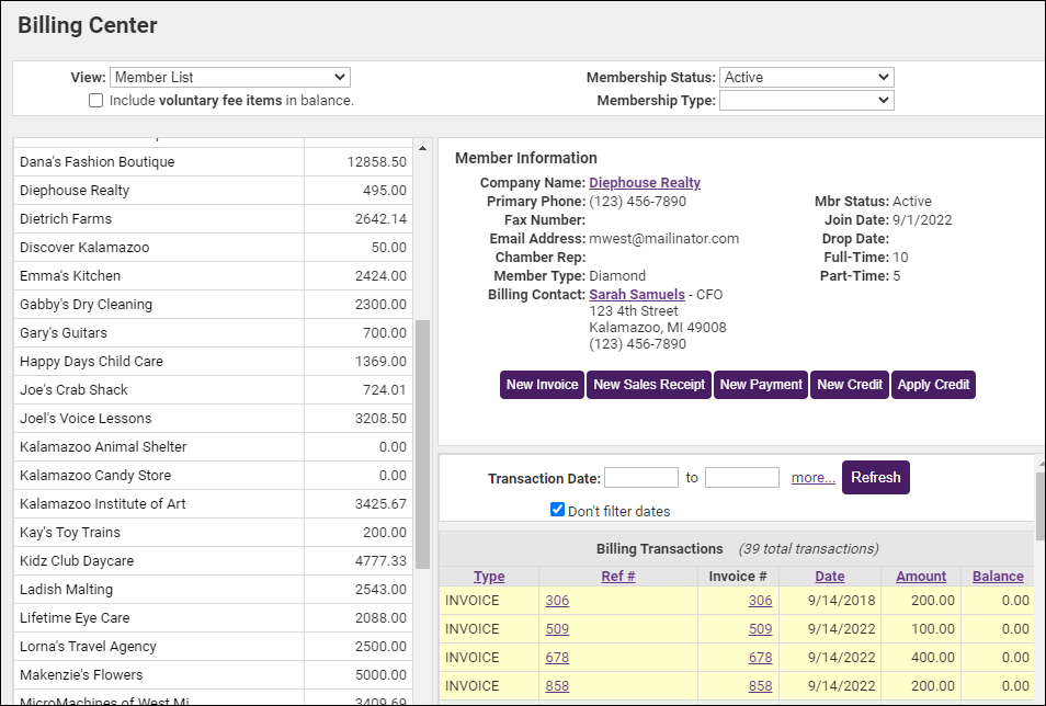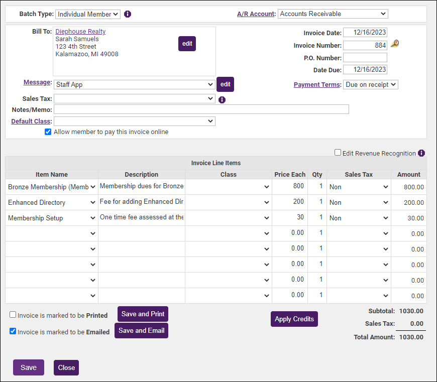 Creating a single invoice may be done within the Billing Center or on a member's Account tab.