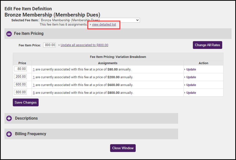 - To view a list of members associated with this Fee Item, select the view detailed list link. This list can be used to change the price of a fee item for individual members.