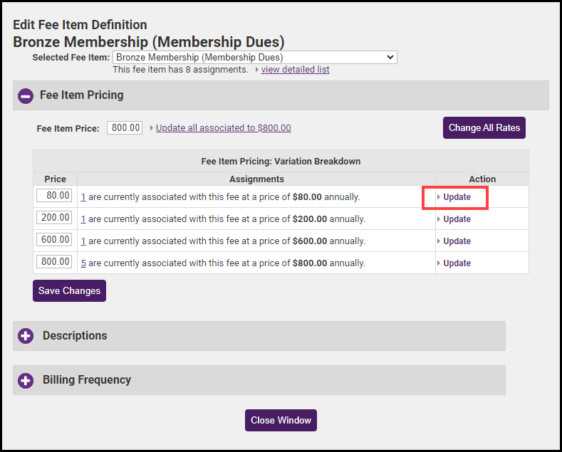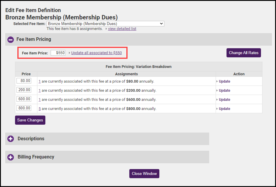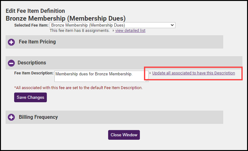 In the Description section, you may update the description of this Fee Item. Select the Update all associated to have this Description link to change the description for every member with this Fee Item.
