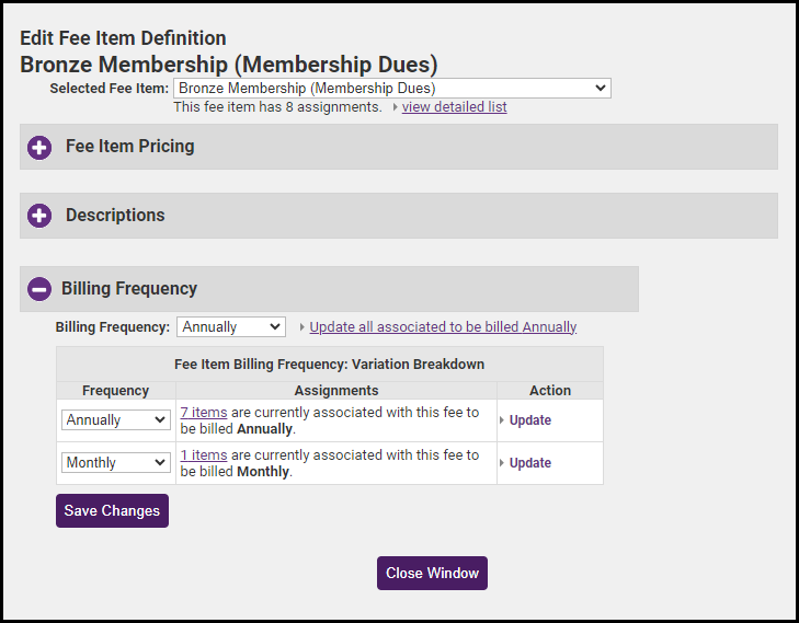The Billing Frequency section allows you to see what frequency each member is set as and what members are assigned to each frequency. All members tied to this frequency will be updated if any changes are made.