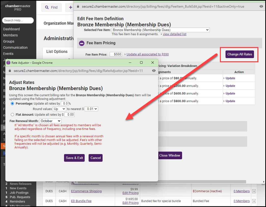 To increase membership dues, use the following procedure to update your membership dues when the Fee Item is currently associated with a Fee Schedule.