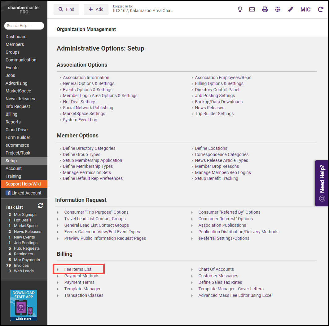 - Click Fee Item List in the Billing section.