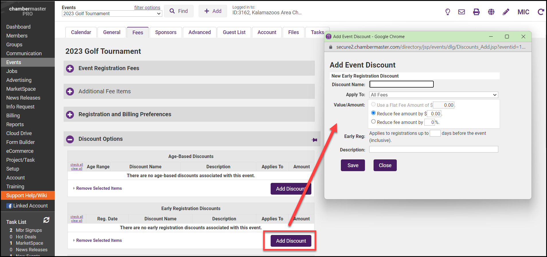 - Click Save. Early Registration discounts will automatically be applied when registering.