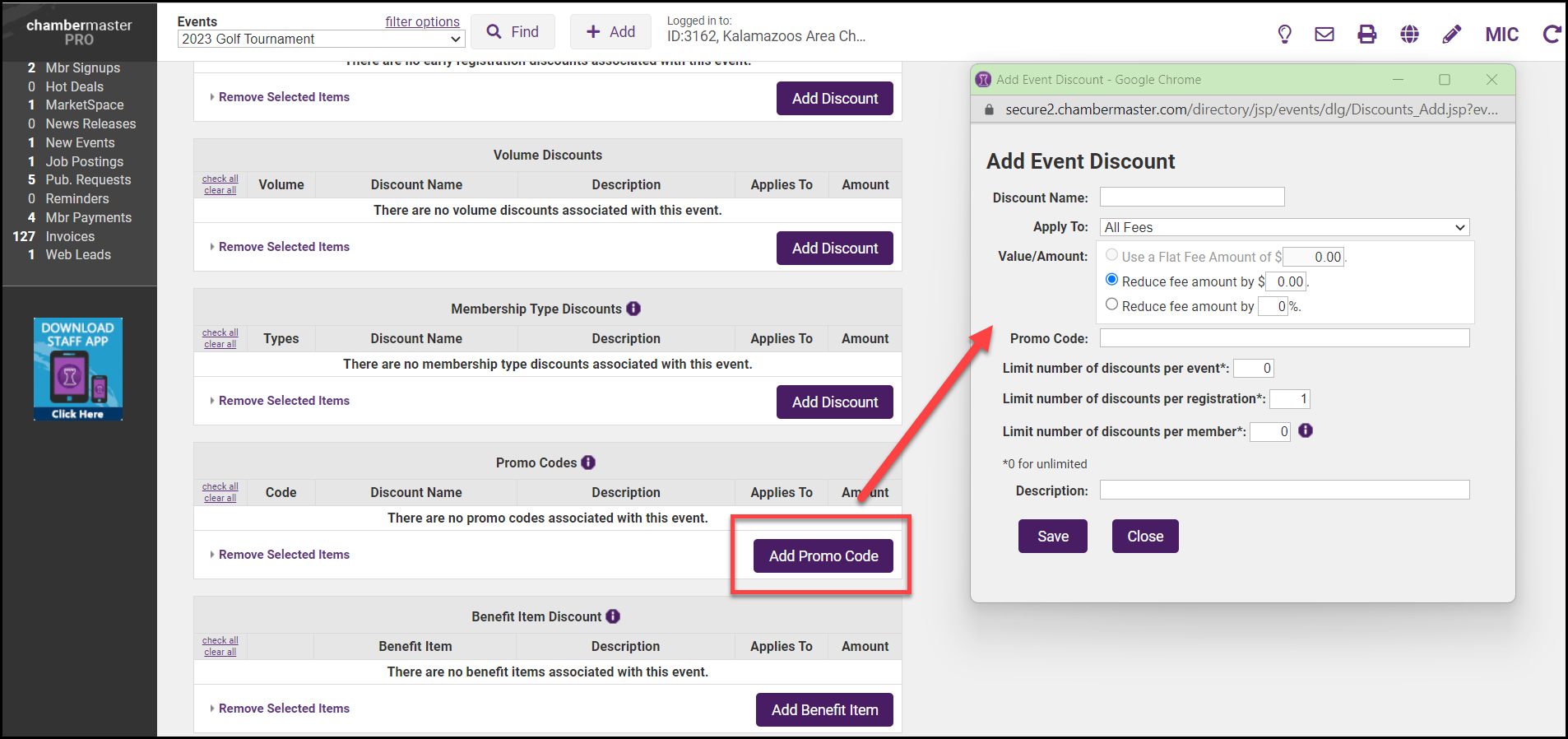 - On the Fees tab, click Add Discount in the Discount Options area under the Promo Code section.