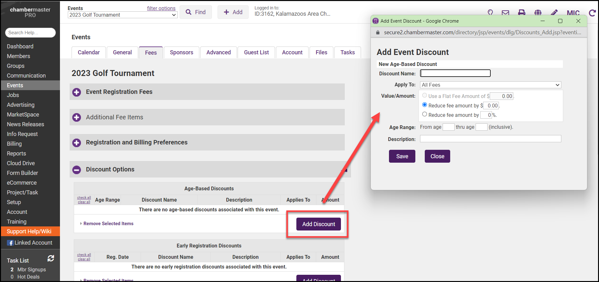 - On the Fees tab, click Add Discount in the Discount Options area under the Membership Type Discounts section.