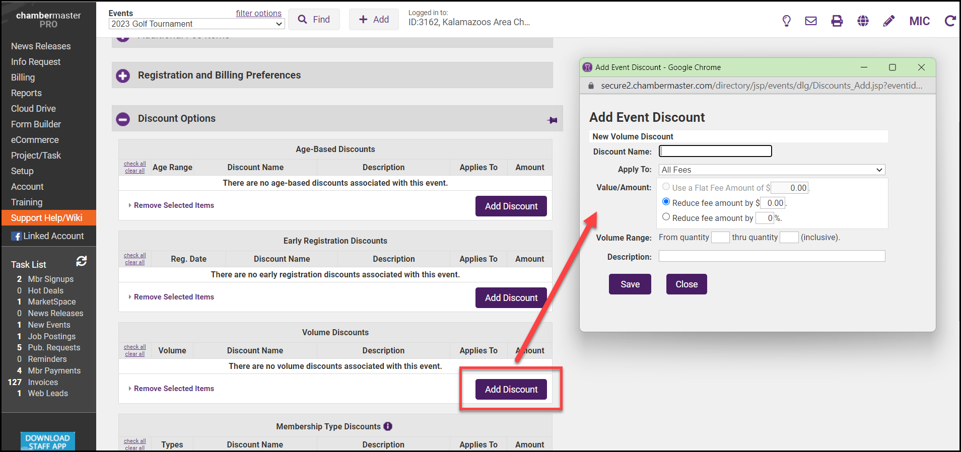 - On the Event's Fees tab, click Add Discount in the Volume Discounts section.