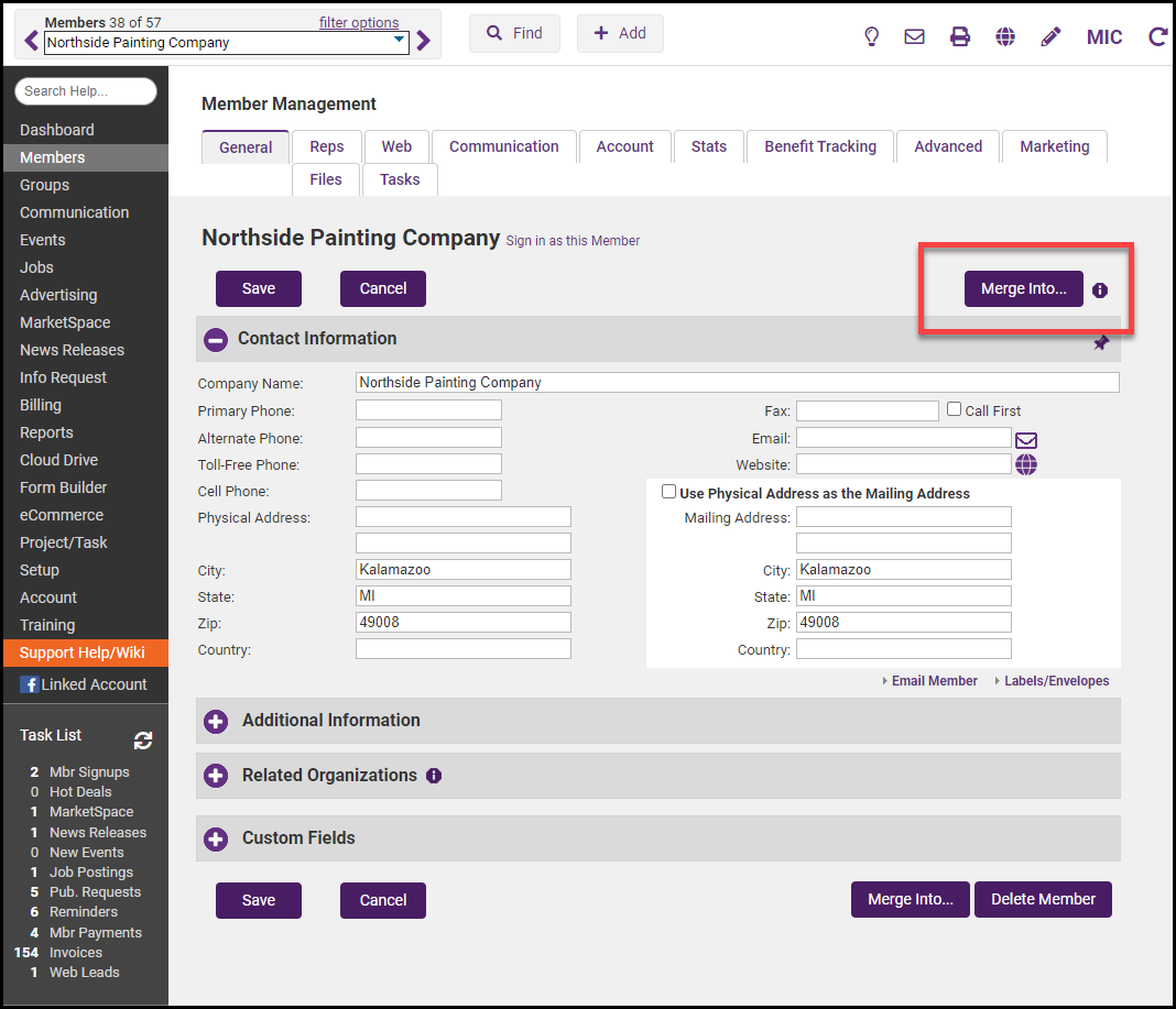 In the event that you have duplicate members in your database (perhaps you had added a prospect, then the prospect applied online), you can easily merge two contacts together. The Best Practice is to merge the older contact into the newer contact. View video.