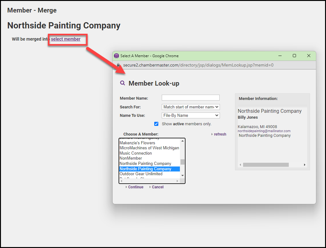 - Choose the member to merge into and click Continue.