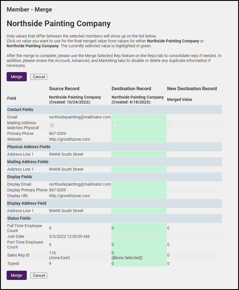 - For each row of information, click either the data in the 1st column (1st member) or the 2nd column (2nd member) to pick which data will end up in the final merged member. Selected data will appear in green.