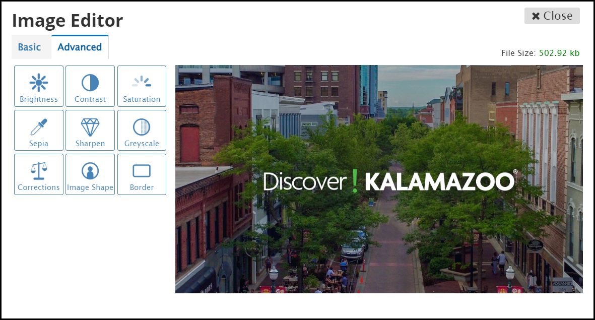 Note: The Image Editor can also be accessed through any content Options that have access to the File Manager such as Image, Slider/Gallery, Text, etc.