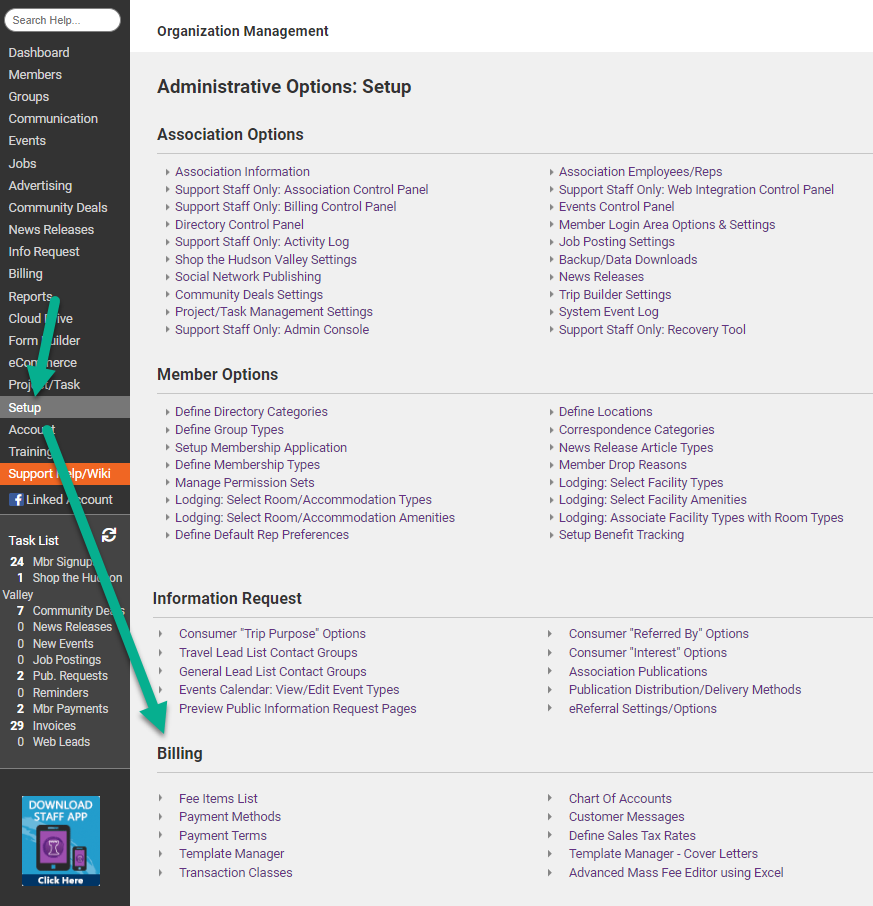 All Users: Set up Membership Fees, Payment Terms, Payment Methods, Customer Messages, and Sales Tax options.