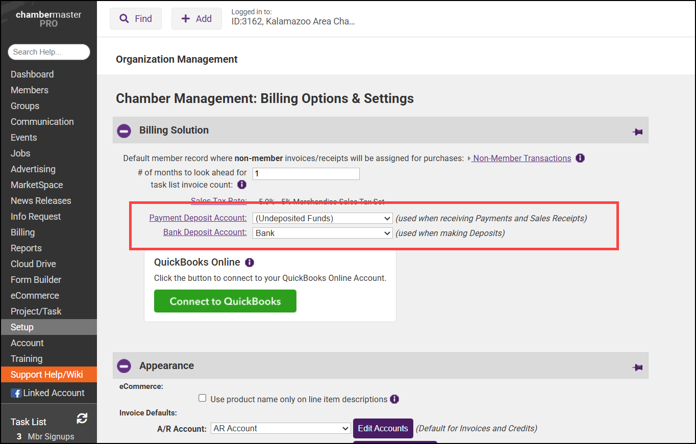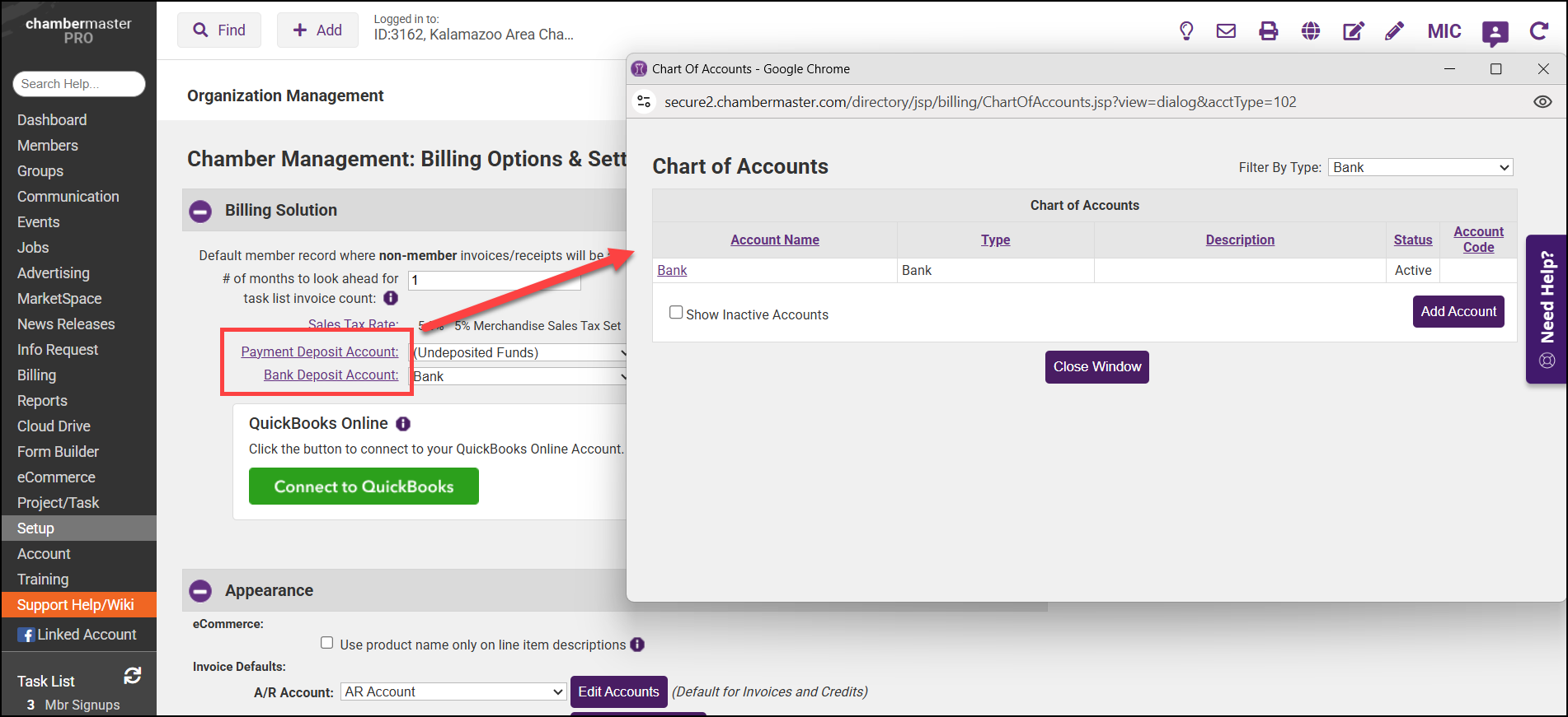 - Change the Payment Deposit Account or Bank Deposit Account by selecting either link and choosing the appropriate account within the Chart of Accounts window.