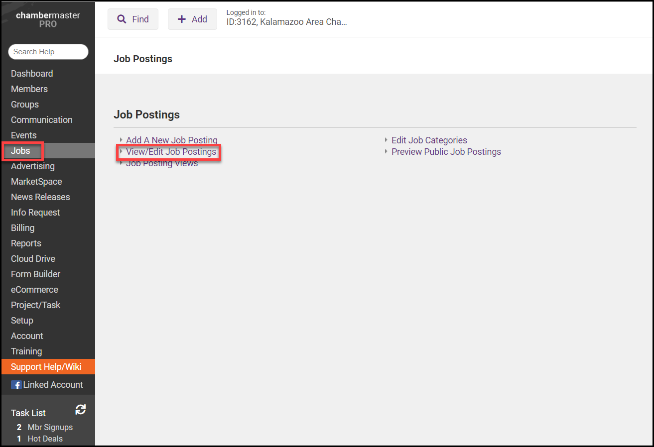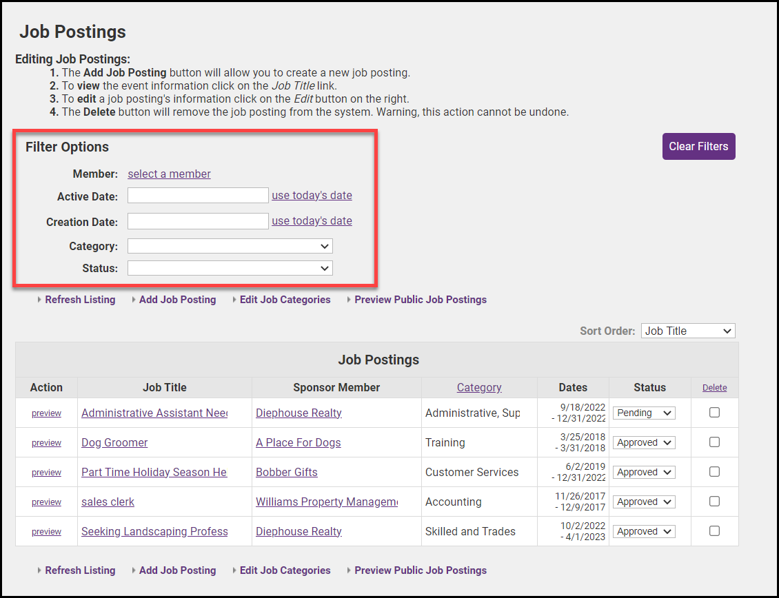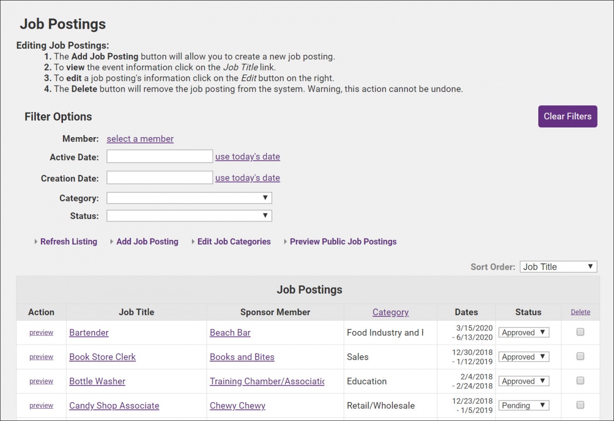 You can view a complete list of all job postings in the Jobs module. You will also be able to approve postings, add new postings, update your job categories, and preview your public page postings.
