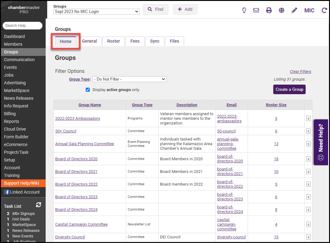 Select the Home tab to display a list of your organization's groups.
