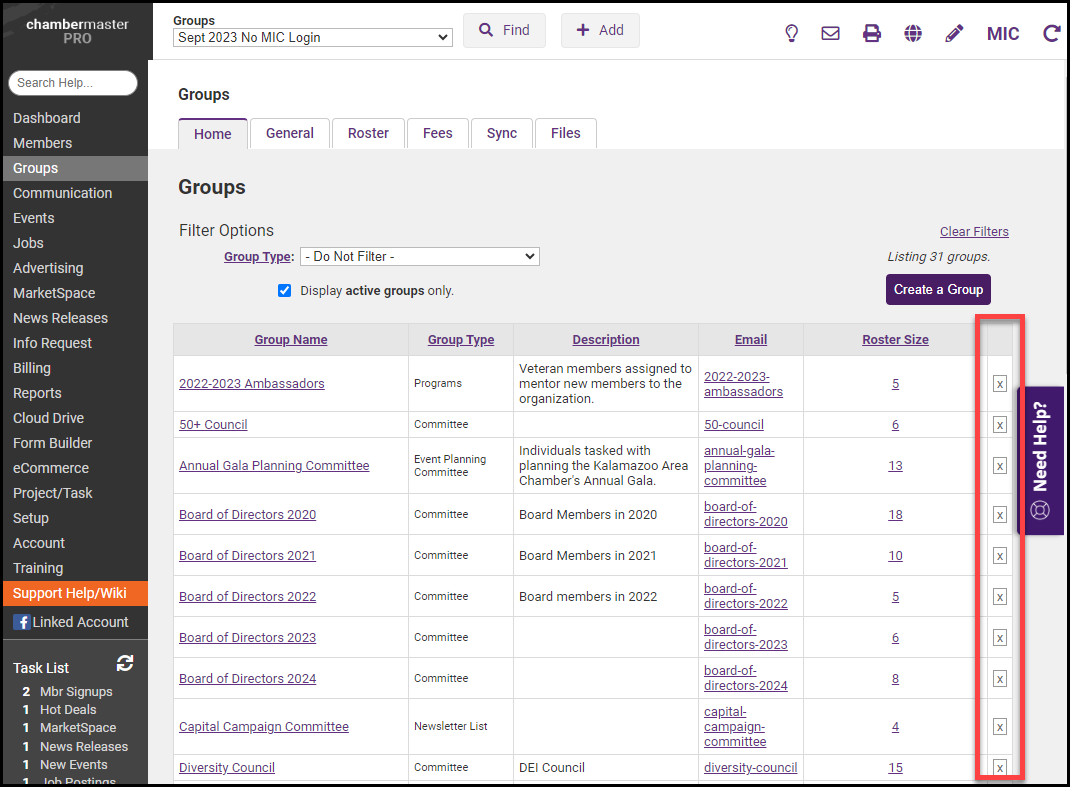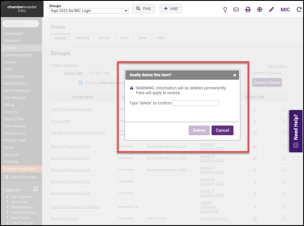 IMPORTANT: Once a group is deleted, you will not be able to undo this action. If you request for the group to be restored by the GrowthZone Support team, fees will apply. |