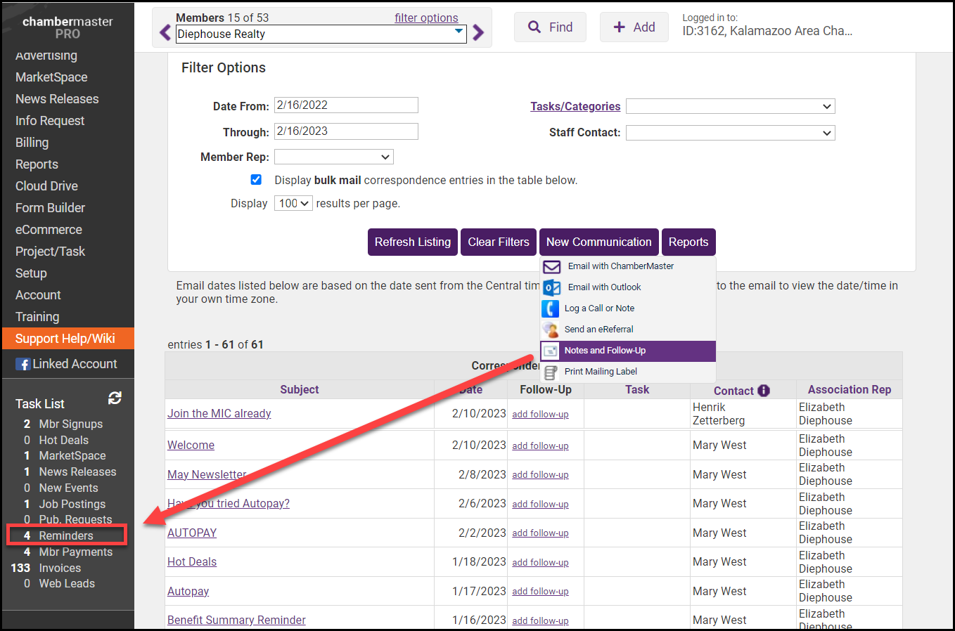 Follow-up reminders may be specified for any communication history item which will display as a Reminder in the Task List on the designated date. Follow-ups may be designated for another staff member to complete by selecting the desired Rep on the follow-up entry. When the Follow-up reminder is due, it will be displayed in the appropriate staff member's Task List under Reminders.
