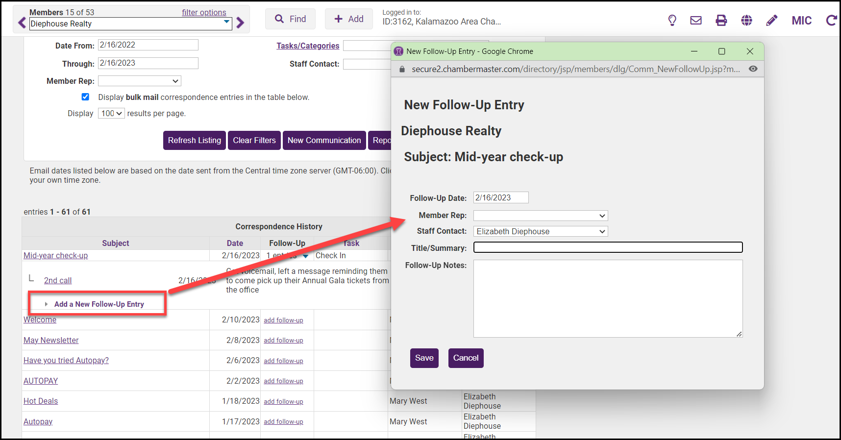 - Find the desired communication that requires a follow-up on the members’ Communication tab.