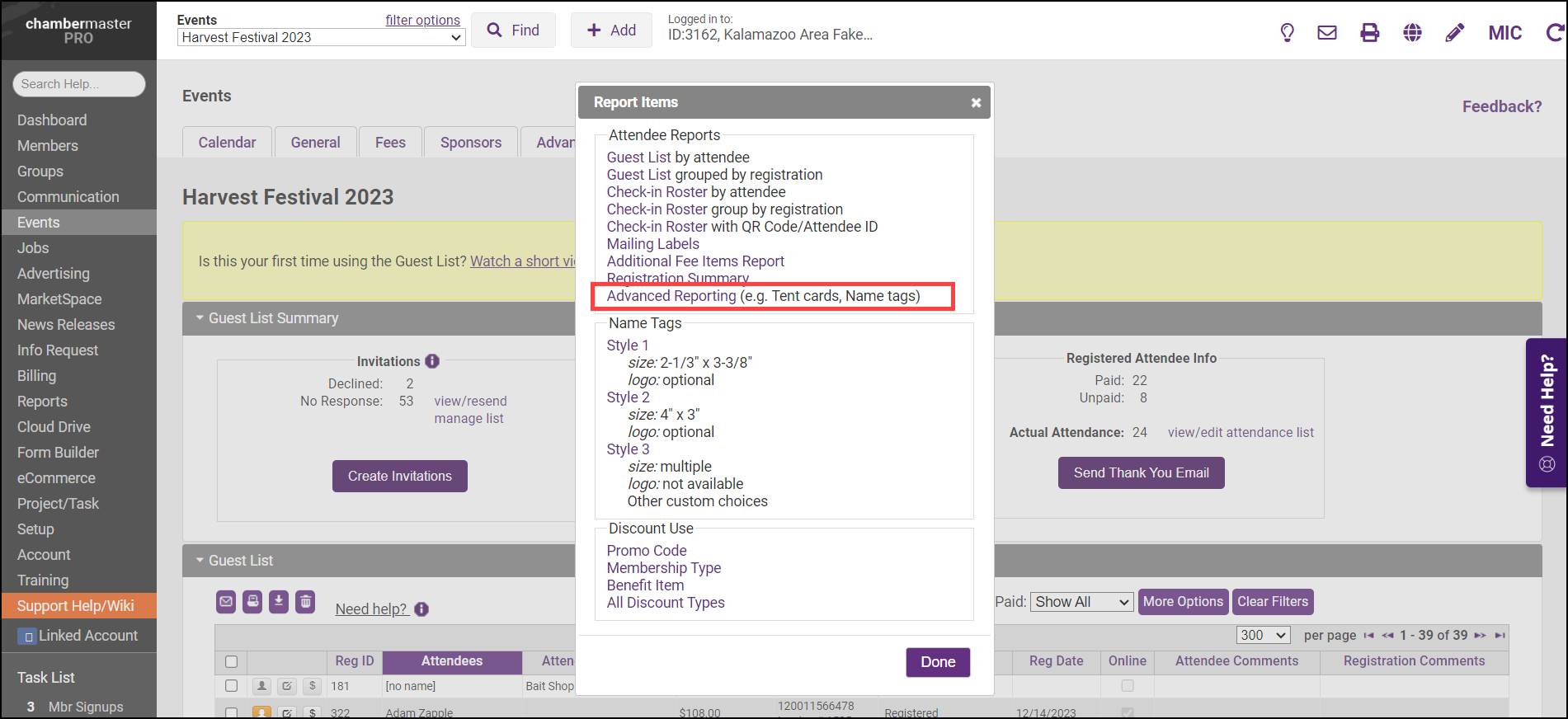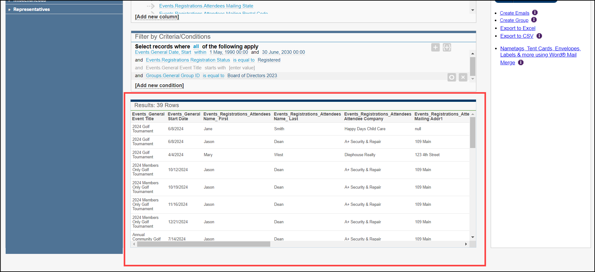 Within your event Guest List, you can generate a report of group members who have registered for your event using Advanced Reporting.