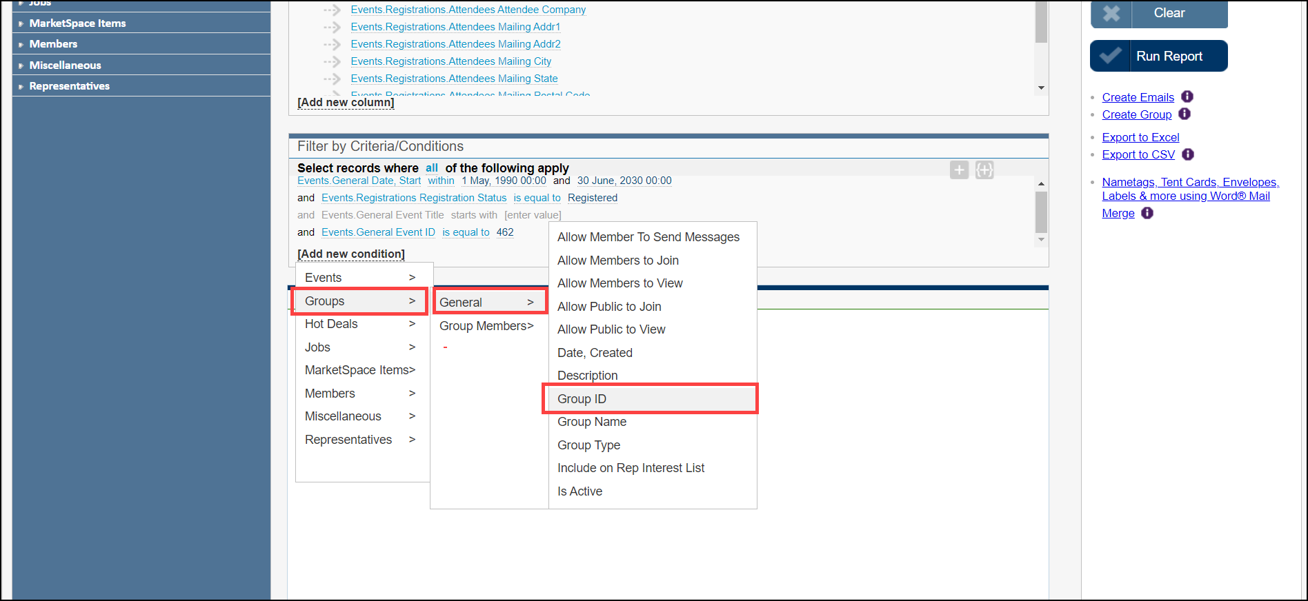 - Groups.General Group ID will be displayed in the Filter by Criteria/Conditions box. Click the select value link to select the group.