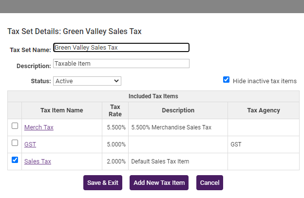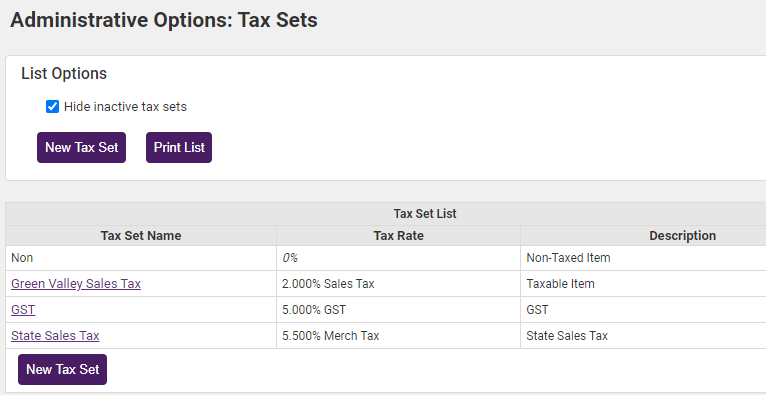 - Click the title of the Tax Set that you wish to modify. (Most likely you will be modifying the “Tax” tax set.) The selected Tax Set will be displayed in purple color.