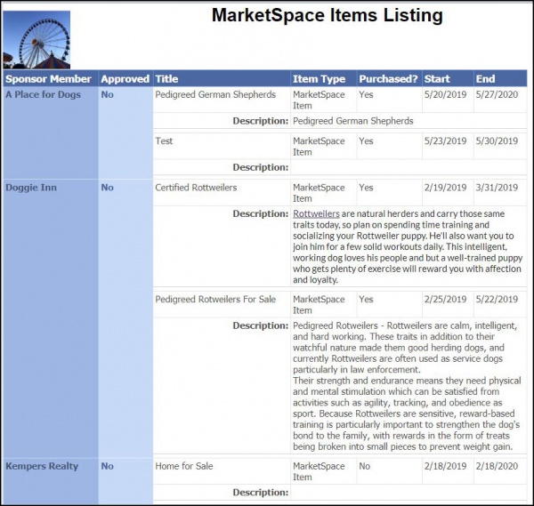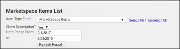 The Marketspace Items List report, allows you to view a list of the MarketSpace items that have been submitted over a selected date range.