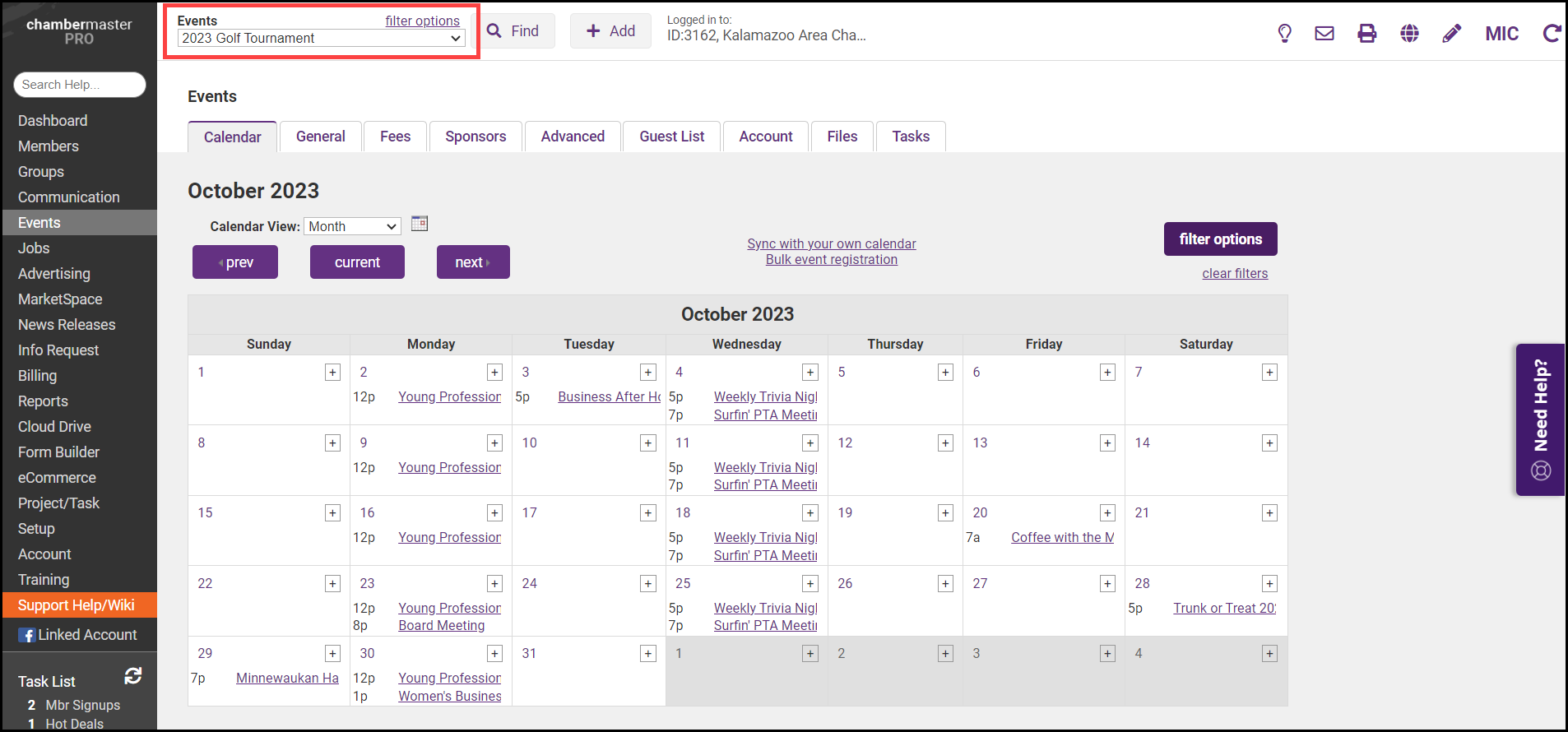- Click Events in the left-hand navigation panel, and select the desired event from the Events drop-down list in the header bar.